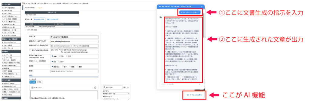 • 機能概要: メール配信等のキャッチコピー、見出し・サブヘッドの作成、及びメール配信やSMS配信におけるメッセージ文章を自動生成する機能です。
