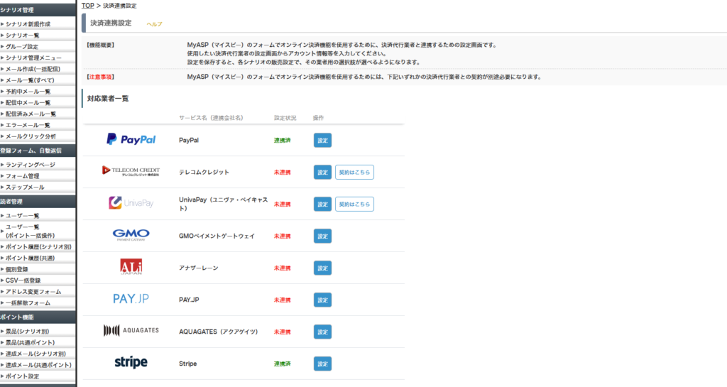 MyASP(マイスピー)が対応している決済代行業者と連動して使う場合は、決済が完了後に、自動的に支払い受領状態として管理されます。銀行振込の方については、入金の確認ができたら、手動で状態を変更してステップメールをスタートさせます。
