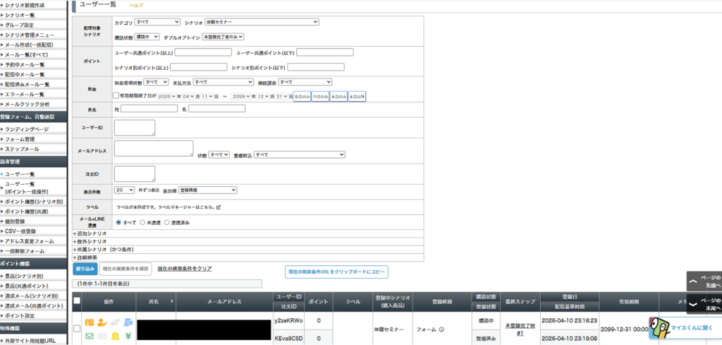 具体的には、登録された読者情報(ユーザー情報)をリスト化し、シナリオ毎に管理することができます。