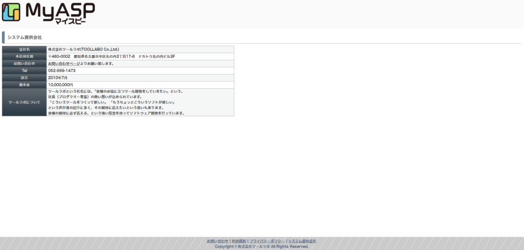※ITツールの画面上では、正式なITツール名:MyASPと記載表記がないのですが、システム提供会社の欄にて、ロゴおよび正式なITツール名:MyASPという文言を確認することができます。管理画面では、ロゴ表記のみとなります。
